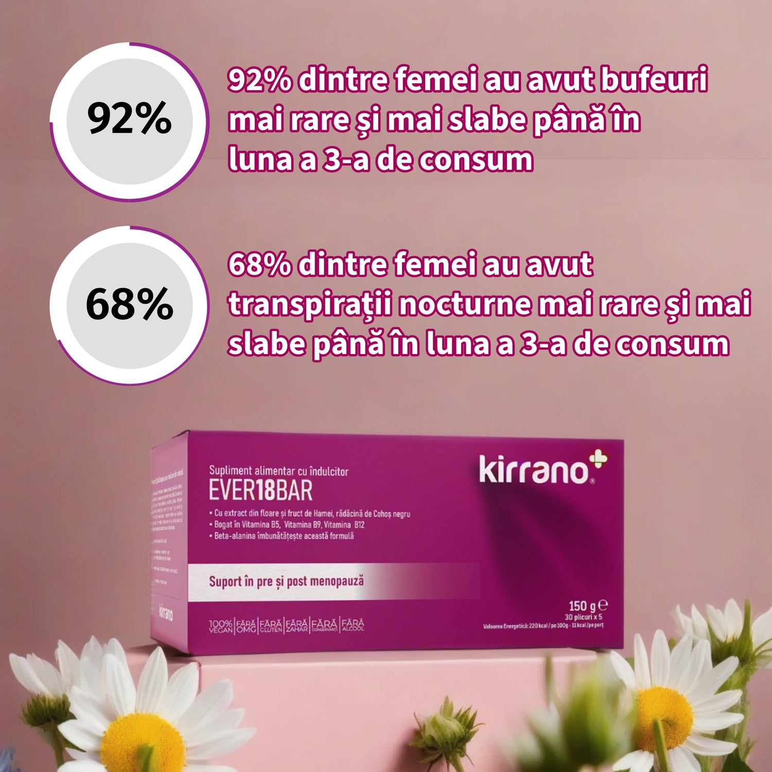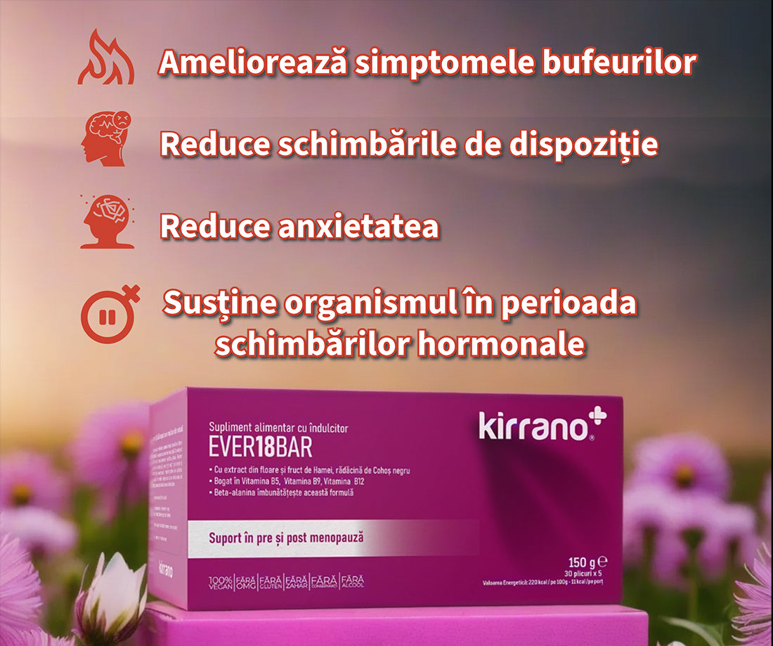 Descoperă EVER18BAR – suplimentul alimentar natural care reduce bufeurile si transpiratiile nocturne, susține echilibrul hormonal și oferă calm și energie în perioada menopauzei. Ajută la un somn liniștit, crește vitalitatea și sprijină sănătatea oaselor.